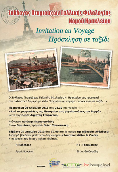 Ο Σύνδεσμος υποστηρικτής μεγαλειώδους εκδήλωσης για την νεολαία με Θέμα ‘’Pourquoi visiter la Crete-Γιατί να επισκεφτείς την Κρήτη’’ που οργάνωσαν το Σωματείο πτυχιούχων Γαλλικής Φιλολογίας.